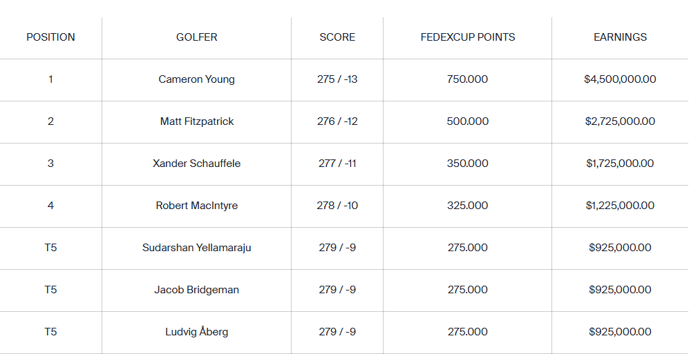 With the win, Young earned $4.5 million from the $25 million prize fund and secured 750 FedExCup points. The victory also grants him PGA TOUR exemption through 2031 and entry into the next three editions of all four major championships. As an added milestone, Young is expected to climb into the top five of the Official World Golf Ranking for the first time in his career.